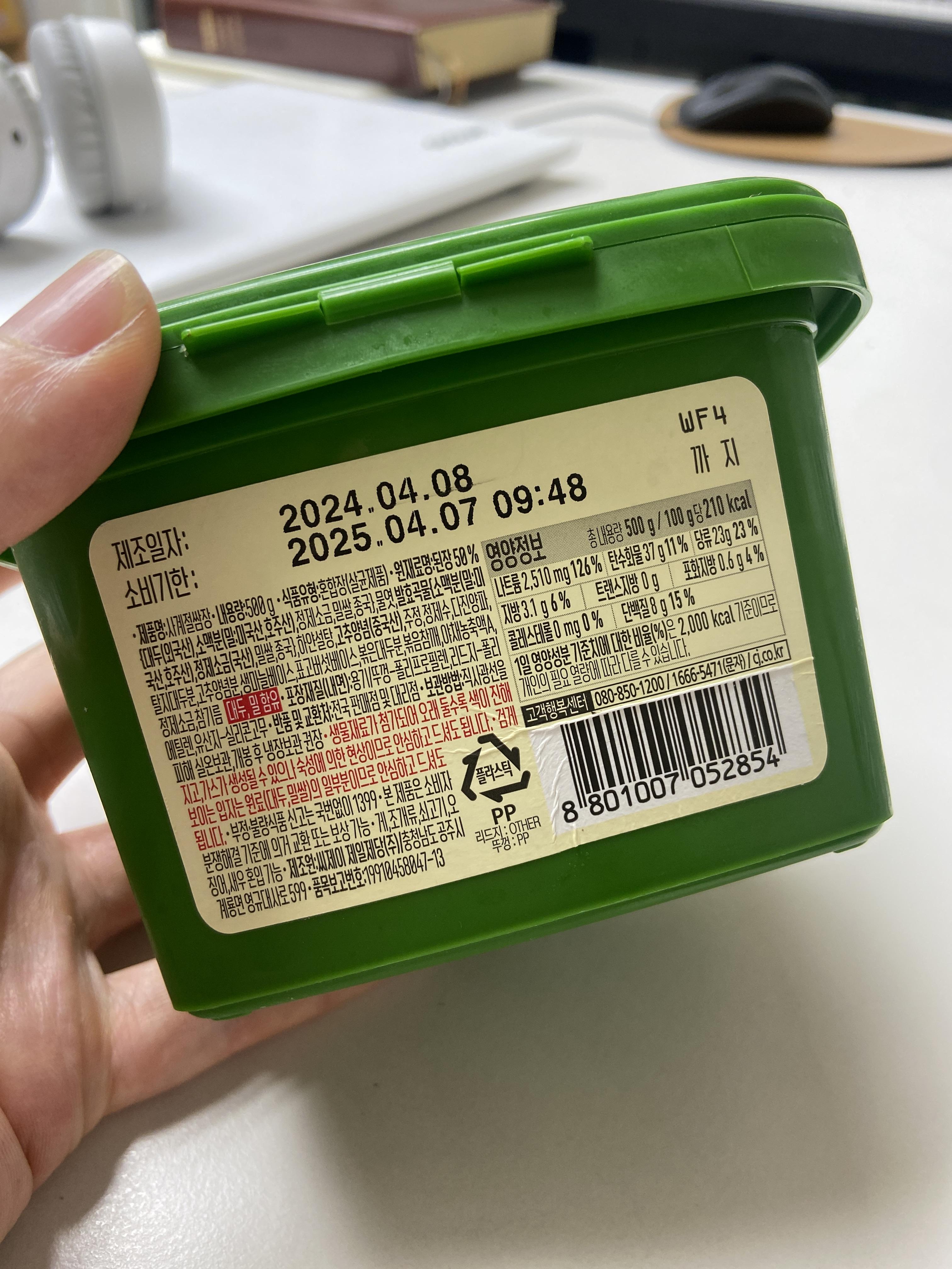 쌈장이 의외로 칼로리가 높습니다 (고추장도 마찬가지죠). 쌈장구입시에는 앞면에 칼로리를 꼭 보셔야하는데요, 제가 지금 가지고 있는 쌈장의 앞면을 보니 100g에 210kcal! 쌈먹으면서 한 사람당 1~2수저정도는 쉽게 먹게되는데요 100g정도면 꽉차게 2수저정도될텐데, 쌈장을 조금 넣을수록 살 안찌는 것, 잊지 마셔야겠습니다!
